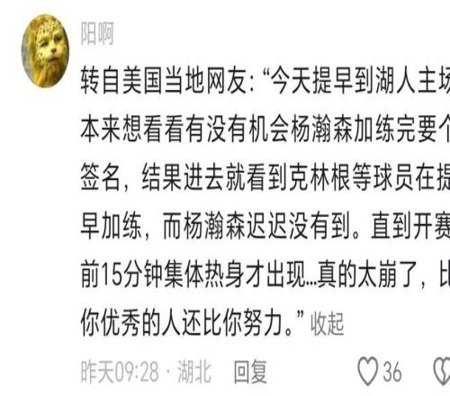 刘维伟在美国时,问杨瀚森有没有加练,他表示没有加练。美国网友也透露杨瀚森没有加练,美国一些球迷提前来球馆看比赛,想找杨瀚森签名,可是杨瀚森没有提前来球馆,倒是看到克林根等人提前加练,而杨瀚森直到开赛前15分钟集体热身才出现。美国球迷叹道:‘真的太崩了,比你优秀的人还比你努力。”看得出杨瀚森是偷懒的,没有姚明易建联等人努力。